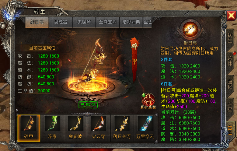 打到的古宝激活之后,在转生里面可以看到,古宝单独是属性不是很高,但是6件套齐了之后,组的是属性很高,如第一件古宝射日弓,6件套的效果是合成锻造一次装备增加属性,这个属性是永久的,后续的古宝要求也是各不相同,属性也是到后面越来越高,所以不能单挑看单件,而且越早弄好越好,打到多余的古宝可以给其他的小伙伴或者分解成碎片合成其他的古宝~