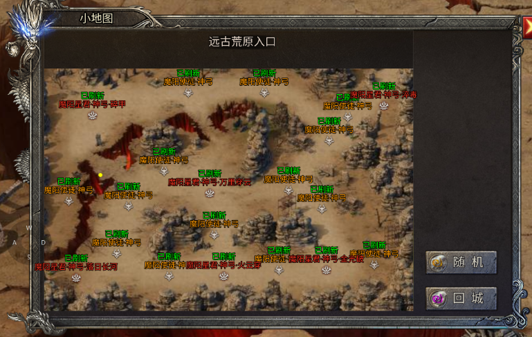 开服第四天开放的远古荒原跨服地图,里面有BOSS与精英怪,打BOSS有大概率会爆古宝,打对应BOSS会爆相应的古宝,打普通的精英怪也会爆古宝碎片,同一个地图里面的古宝碎片是一样的,所以如果抢不到BOSS也可以打精英怪获得碎片进行合成。