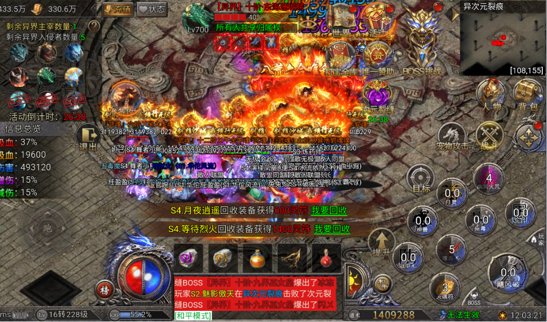 玩法介绍:活动开放期间会刷新9只次元裂缝BOSS,可以爆出大量的装备材料和完整的特戒。而且是全员归属,参与击杀了就可以拿到大量的奖励,奖励直接发到背包里(背包满了会发到邮件),怪物每10分钟就会刷新一波。