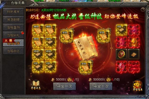 合服直购里面充值获得的寻宝券可以用来抽取技能书哦,也可以花费灵符进行抽取,5万灵符寻宝一次,50万灵符寻宝十次。本次活动也是开放了9级技能书,终极技能书就是9级技能书噢,在上面是神级和圣级。可以根据自身所需来抽取