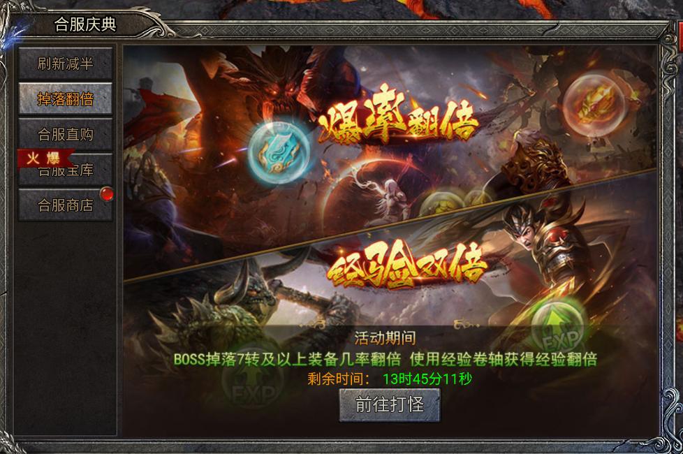 活动开启期间所有的boos刷新时间都会减半(包含等级、英魂、符文、龙裔、异兽、修罗、天空、禁地、无疆)并且boos掉落7转及以上装备几率翻倍,期间使用的经验卷轴会获得经验翻倍,所以注意好活动时间利用该活动可以提升等级战力,多刷boos掉落换取更好的装备。