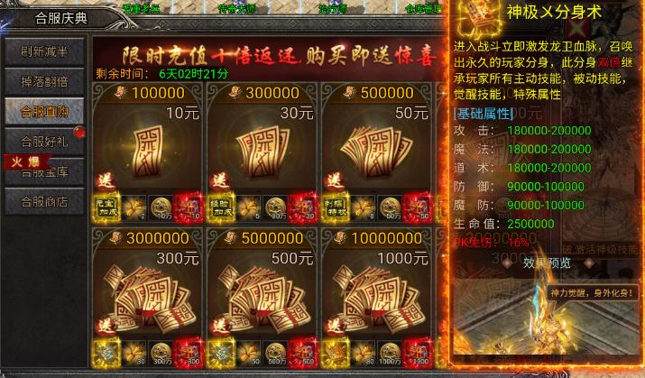 合服直购10元档元宝加成、30元档经验加成、50元档刺探情报、100元档双倍刺探、300灭魂符觉醒、500元档嗜血术觉醒、1000元档神级护体神盾、3000元档神级分身术。300档和500档的技能加成是根据当前角色的技能哦。推荐平民普通玩家可以入手前四个档位哦,元宝加成和经验加成在游戏中都是起到相当大的作用的,相信玩过的小伙伴都深有体会哦~战场刺探次数加成和双倍刺探的奖励也是不错的。
