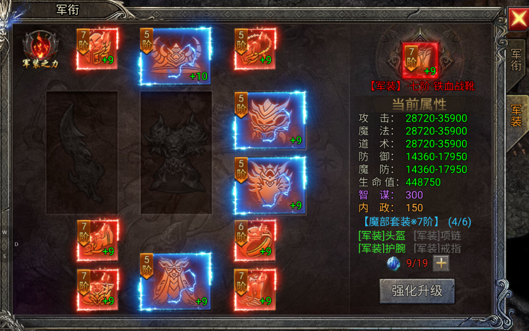 军衔系统需要区服进行了合区之后才会开启,军衔需要使用虎符和传奇币进行提升。虎符需要参与活动或者购买礼包可以获取,军衔可以提升角色各属性加成还有额外在跨服生存的能力,军衔越高的玩家在跨服就能愈发的无往不利。军衔下面还有个军装系统,该系统可以认为是另外一套角色装备,也能增加角色各项属性。