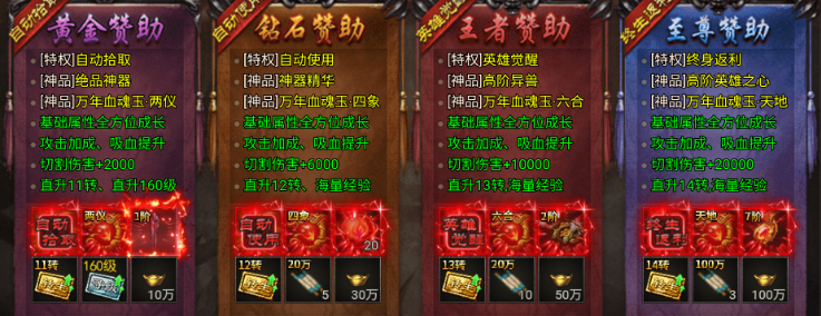 前期必须要有这四个档位的赞助,可以获得自动拾取(击杀怪物即可自动拾取特权)-自动使用(可在背包内自动使用特权)-英雄觉醒(可使获得的英雄觉醒-继承100*角色属性-输出战力x3)-终生返利(激活至尊赞助,每日可返利30万的灵符)无时间限制永久时限,在前期刷怪很快,节省了很多的时间,可以无视前期转身,14转身直上卡,可以省到前期很多时间,无需在前期浪费时间去打转身单去转身.