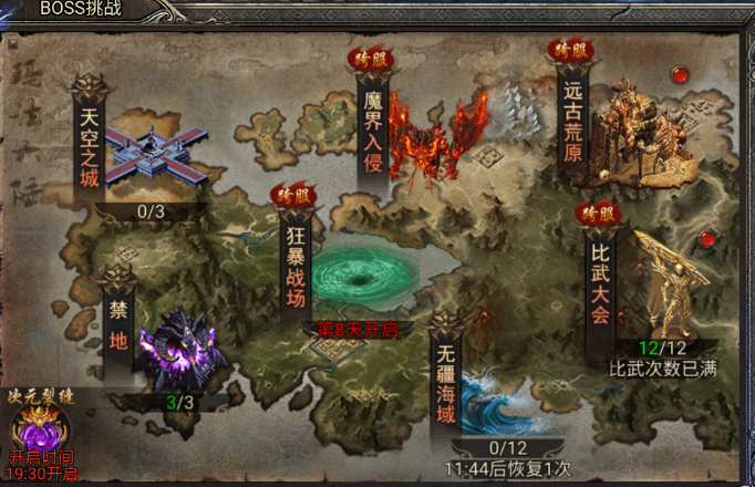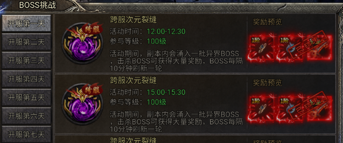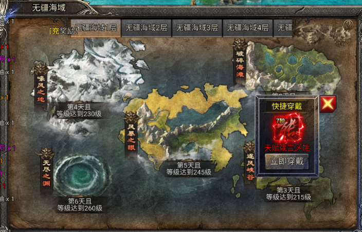 每日任务栏都会提示红包悬赏还有禁地boss,在1-7天的区服内每日都会多开启一个无疆海域的地图,一小时刷新怪物副本次数,地图里会获得天赋字 吸血装备 还有符文.图下