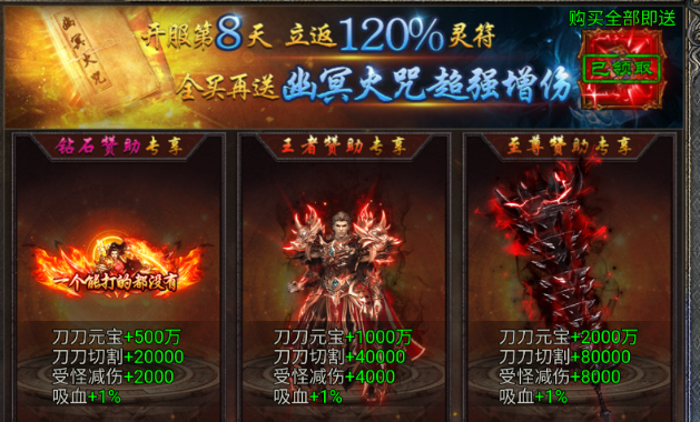 激活前四档位的赞助即可区开服活动中购买低价专享的时装-称号-幻武(都附带吸血*1-刀刀切割-刀刀元宝以及受怪减伤2000+4000+8000)
