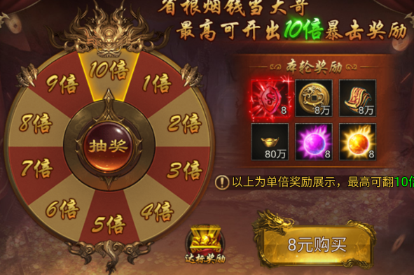 开区第二天开启每日暴击转盘,有条件的就必需要弄,随机转盘1-10倍的概率,运气好可获取大量材料,省去很多充值,还可以获得大量灵符以及武神残魂.图下