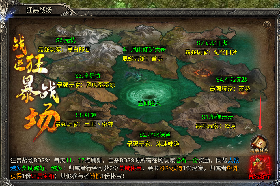 击杀BOSS时所有在场玩家必得一份奖励,同帮人数越多奖励越好、越多!归属者行会可获2份荒域秘宝,会长额外获得1份秘宝,归属者额外获得1份归属宝箱;其他参与者随机1份秘宝!