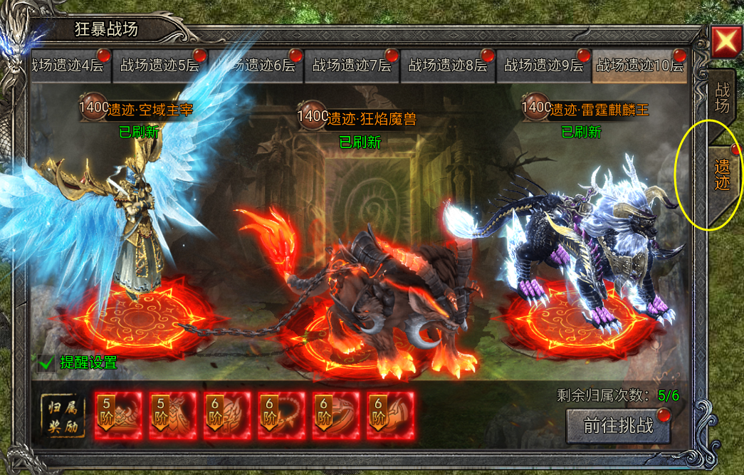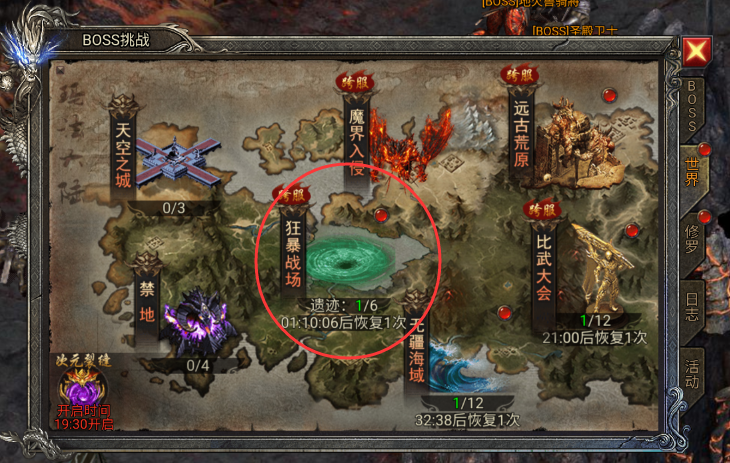 1. 狂暴战场里面还有一个遗迹的地图,大家不要错过了哈,遗迹最多可以恢复6次归属,获得1次BOSS归属后消耗1次归属次数,每隔2小时恢复1次。