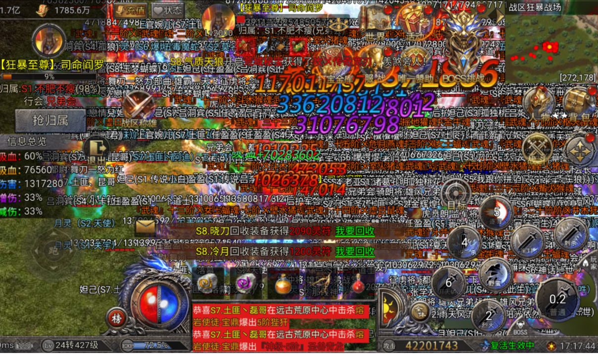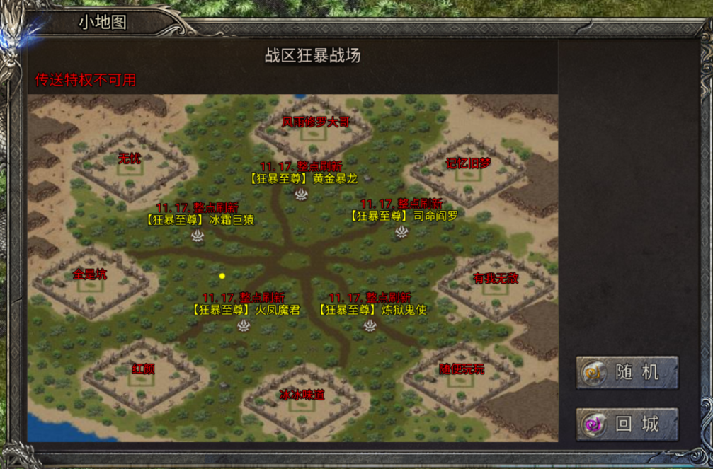 如上图所示,每天固定时间会同时刷新5只狂暴至尊boss,该地图不可使用传送特权,不可拉令,只能随机,可以提前组织行会的玩家前往击杀,该boss有归属,最终归属判定为最终击杀者和击杀者所属行会