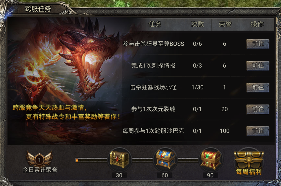 每天完成跨服任务,每日达到一定的荣誉积分还可以领取宝箱,记得领取哦~同时每周达到一定的荣誉积分还可以获得大量的奖励,小伙伴们快去做任务吧。