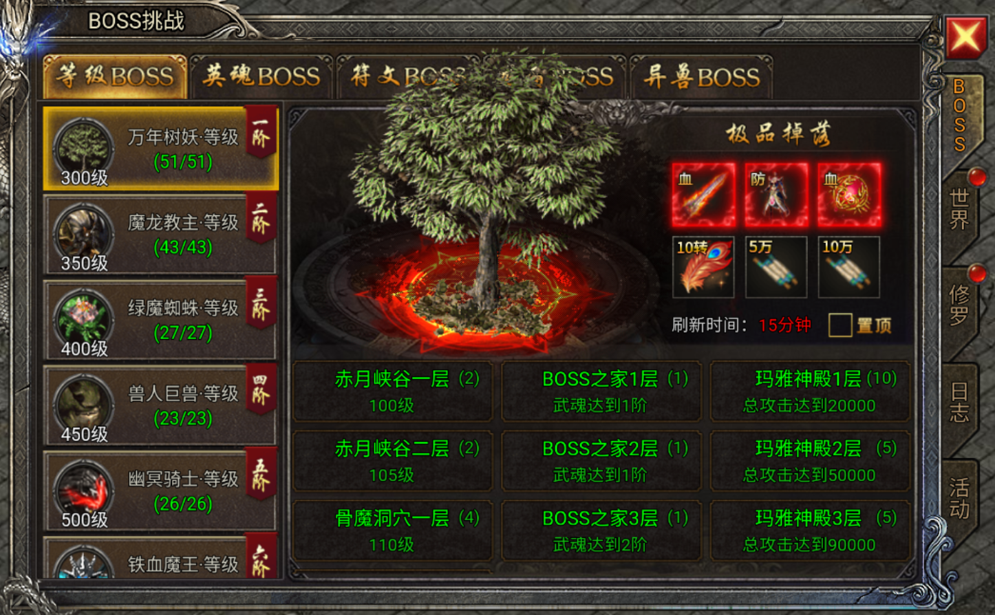 游戏内有各种BOSS,其中等级BOSS会掉落大量经验卷轴,想要快速升级需要多打等级BOSS。