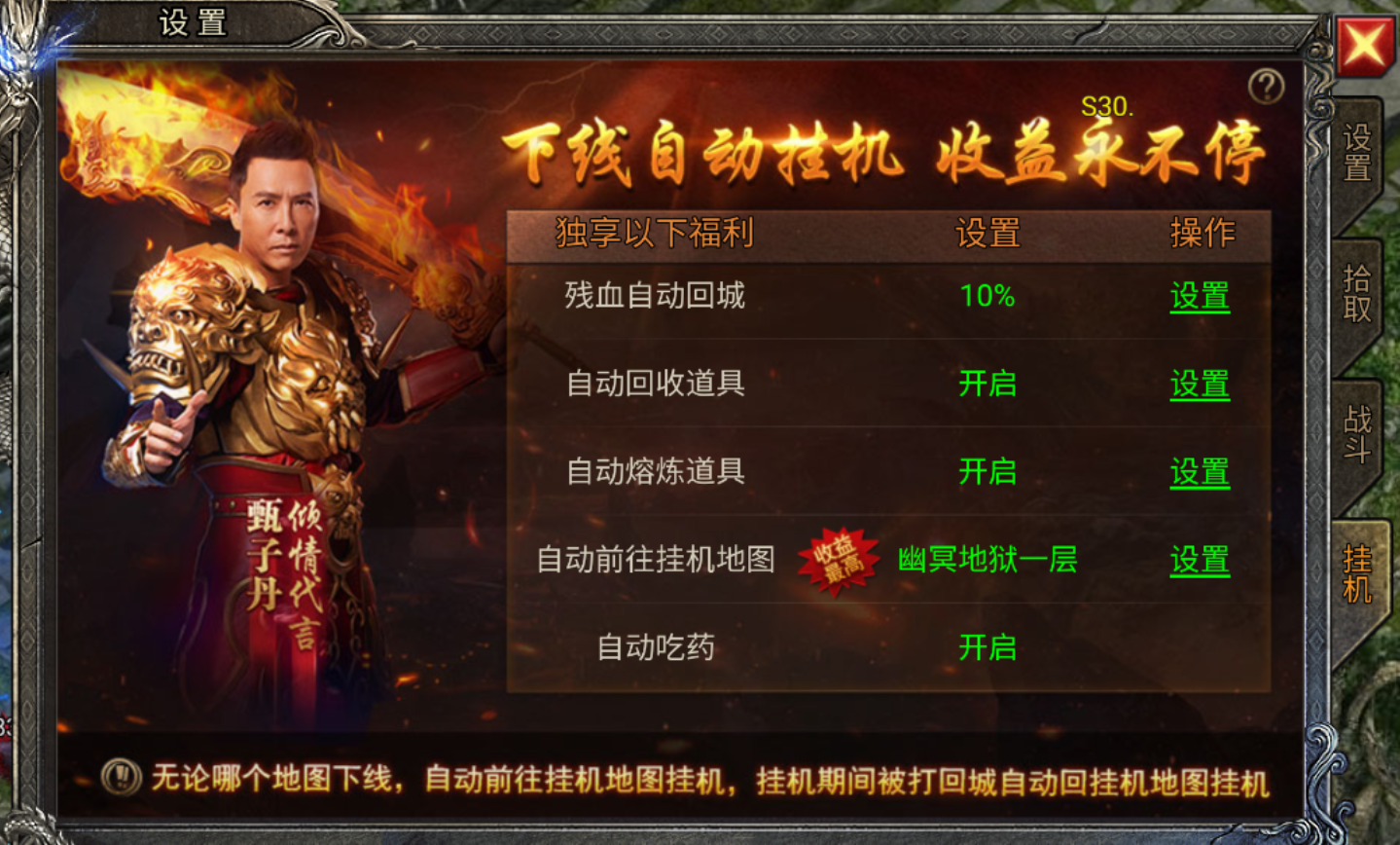 那么选择好的地图就必不可少,有些兄弟们喜欢选择挂机在BOSS之家这种地方,但是BOSS之家内是没有小怪的,相对来说升级并不快。想要快速提升等级应该选择等级BOSS内的野外地图进行挂机。无法长时间在线挂机的兄弟也不用担心,游戏内是免费赠送离线挂机功能的。点击设置——挂机,即可设置离线挂机功能。